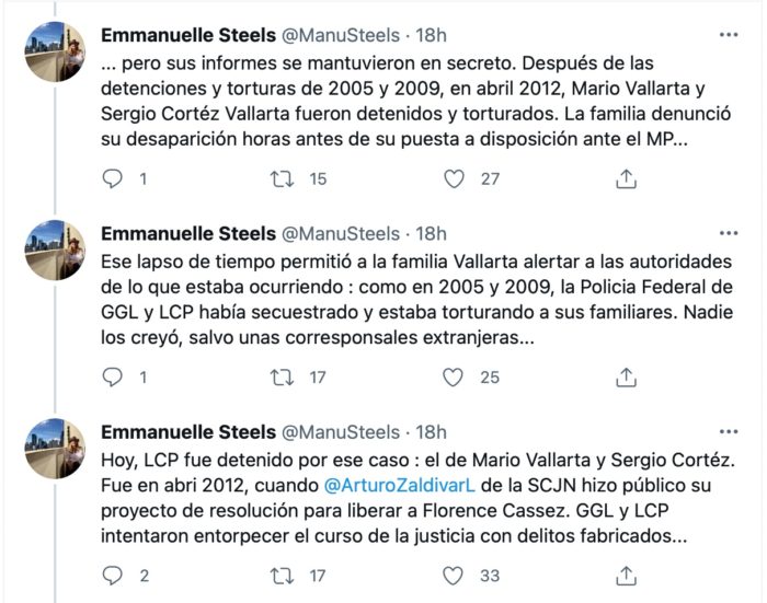 Finalemente, hay que resaltar que ningún miembro de la familia Vallarta, ni Florence Cassez, ni David Orozco fueron detenidos, o por lo menos no legalmente. Fueron secuestrados, torturados y exhibidos en los medios de comunicación. La detención de hoy fue bastante diferente…