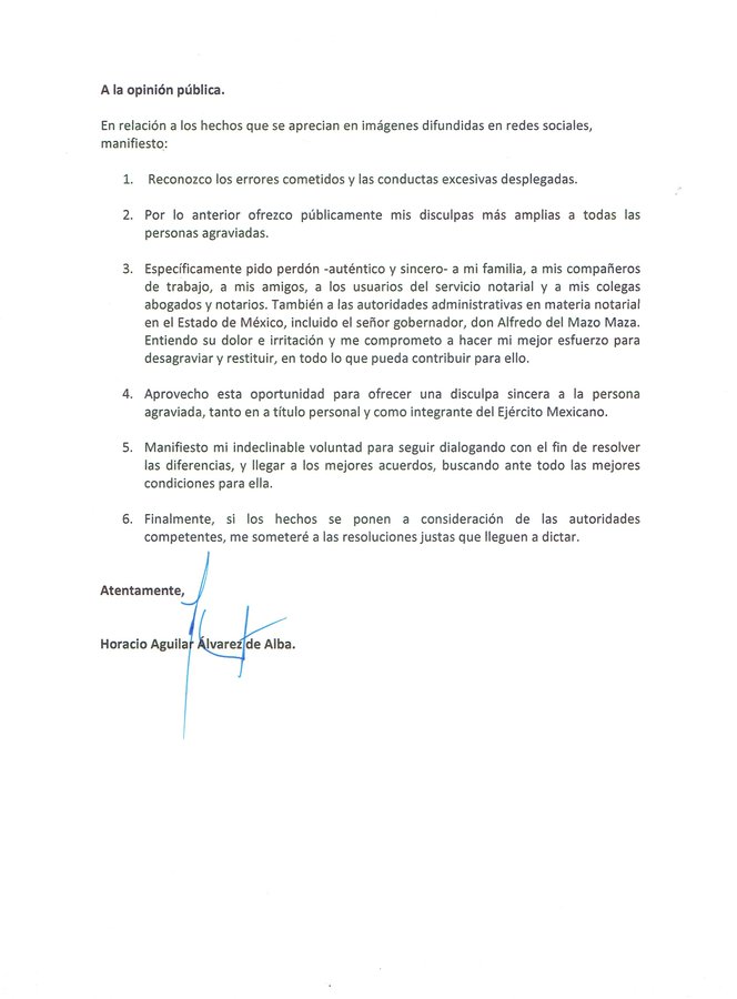 - Específicamente pido perdón -auténtico y sincero- a mi familia, a mis compañeros de trabajo, a mis amigos, a los usuarios del servicio notarial y a mis colegas abogados y notarios. También a las autoridades administrativas en materia notarial en el Estado de México, incluido el señor gobernador, don Alfredo del Mazo Maza;