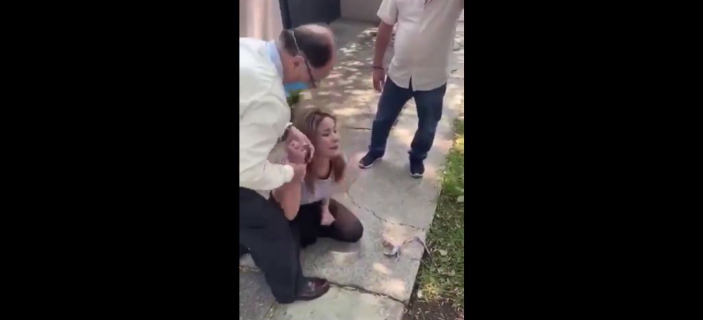Rodeada por testigos, la mujer pide ayuda y que llamen a la policía, mientras que ellos preguntan si es su esposa. “¡Ah, son esposos!” respondió un varón a otro que atestigua el incidente. “Entonces no se puede meter”, le responde.