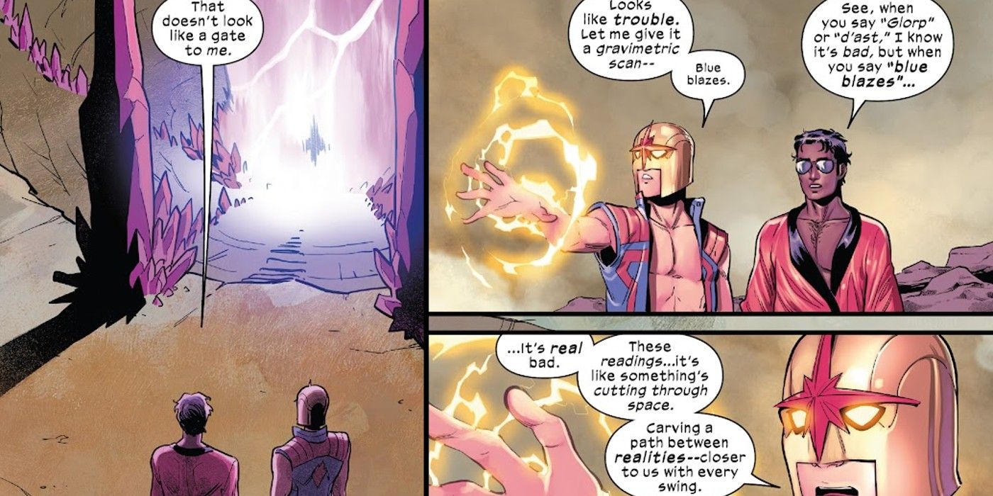Entre su tiempo con los X-Men en Arakko y su papel de liderazgo en Guardianes de la Galaxia, Nova es un héroe muy solicitado en los cómics de Marvel actuales. Tiene tanta demanda, de hecho, que en X-Men Rojo #11 (por Al Ewing, Jacopo Camagni y Federico Blee) Nova admite a Sunspot que solo está en su día de spa Arakko por insistencia de su terapeuta. Poco después, una presencia misteriosa activa una advertencia del portal interdimensional conocido como la Puerta Externa. Cuando Nova y Sunspot investigan el portal, encuentran a Jon Ironfire, el luchador por la libertad mutante del recientemente corregido pecados de siniestro línea de tiempo alternativa. En estado de shock, Nova pronuncia su eslogan. “¡Destellos azules!”con Sunspot señalando que la frase significa que las cosas son en realidad malo.