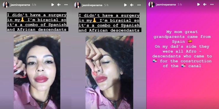 Parece que algunos de los seguidores de Instagram de Jasmine le enviaron un mensaje pidiéndole detalles sobre su origen étnico. Jasmine publicó otra historia con algunos detalles más. Explicó que los bisabuelos de su madre son de España. Según Jasmine, los antepasados de su padre eran “Afrodescendientes”Quien vino a Panamá para la construcción del Canal de Panamá.