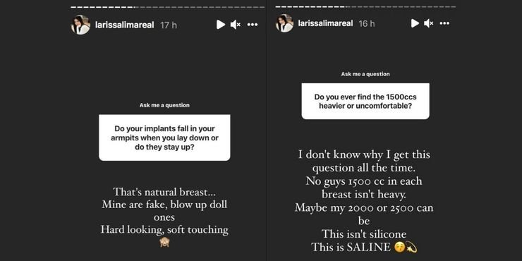 Larissa respondió recientemente algunas preguntas curiosas sobre sus senos más grandes. Durante una sesión de preguntas y respuestas en Instagram, un fan le preguntó si sus implantes de solución salina de 1500 cc se sienten “pesado o incómodo?“Larissa reveló que recibe esta pregunta todo el tiempo. Ella respondió:”No hay muchachos 1500cc en cada pecho no es pesado.” Ella añadió, “Tal vez mi 2000 o 2500 pueda serlo. Esto no es silicona. Esto es SALINA.