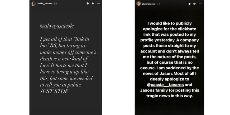 La empresa para la que trabaja Nicole no siempre le dice la naturaleza de las publicaciones. “Pero, por supuesto, eso no es excusa,” Ella admitió. Nicole dijo que ella es “entristecido por la noticia de Jason.“Luego se acercó a los seres queridos de Jason y Cassia y la etiquetó para”disculparse profundamente“Por haber publicado el”trágica noticia de esta manera.“Una captura de pantalla de la historia de Nicole también fue compartida por Prometido de 90 días el bloguero John Yates en su Instagram. Explicó que, como alguien que solía tener clickbait, “no tenemos control sobre lo que publican. ” John mencionó que la compañía también toma sus datos de inicio de sesión y publicaciones a voluntad.