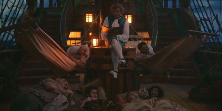 Otro adorno se centra en las políticas de pago progresivo de Stede Bonnet. En desafío a la tradición pirata habitual de pagar a su tripulación con partes del botín robado, Bonnet pagó a su tripulación un salario semanal. Esto también es cierto de Nuestra bandera significa muerteLa versión de Stede Bonnet, pero lo hace para evitar el estrés en el lugar de trabajo y no por ignorancia de las realidades de la piratería. Con ese fin, también establece un centro de recreación con una cancha de tenis completa y un musical “mermelada” habitación, lo que hace que su barco se parezca más a un crucero que a un barco pirata.
