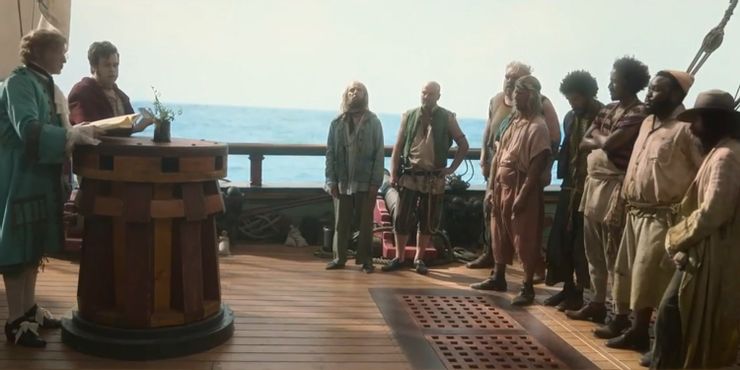 Ewen Bremner como botones: Visto como un fiel compañero y un verdadero amigo por Stede Bonnet, Buttons está esperando su momento hasta el inevitable motín contemplando qué miembros de la tripulación deben ser devorados primero en caso de emergencia. Buttons es interpretado por el actor escocés Ewen Bremner, quizás mejor conocido por interpretar a Spud Murphy en Avistamiento de trenes. También interpretó el papel del francotirador Charlie, que formaba parte del equipo de comandos de Diana en Mujer Maravilla.