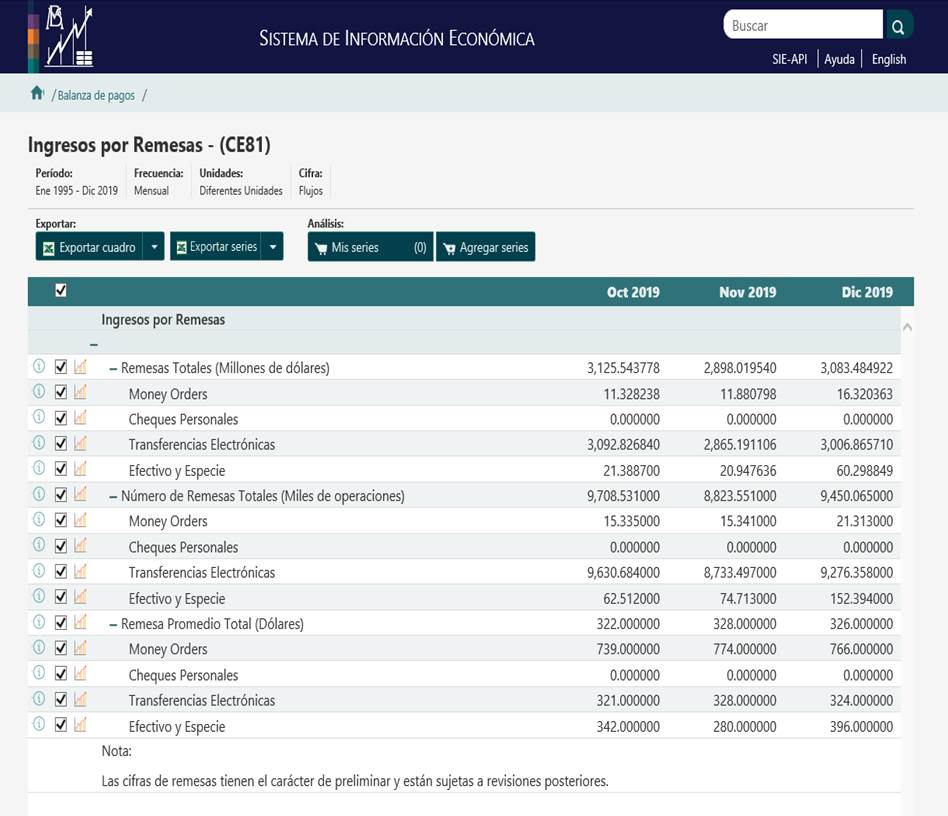 El banco central señaló que las transferencias electrónicas resultaron el medio idóneo para el envío desde el exterior, con 35 mil 508 millones de dólares de enero a diciembre de 2019.