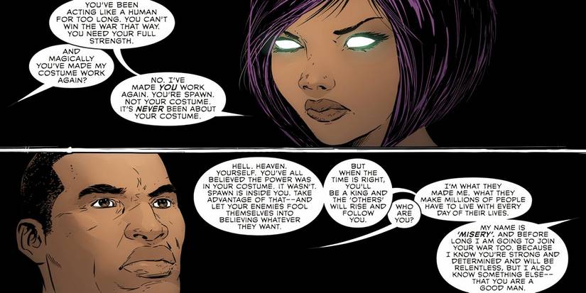 Después de ese momento, Cyan pudo hacer todo lo que los lectores la ven hacer en Misery, incluida y especialmente su capacidad de hacer que otros sientan el dolor de sus propios pecados, que usa para matar a un demonio literal y salvar la vida de Spawn.