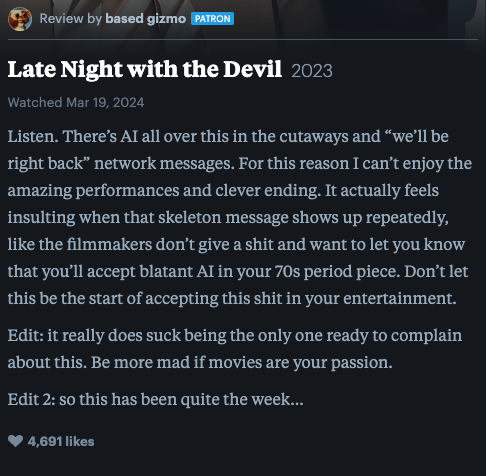 Una reseña de Letterboxd de Gizmo basada en usuarios fue la primera en expresar su decepción por el uso del arte de IA en la película, y escribió: “Escuchar. Hay IA por todas partes en los cortes y mensajes de red de “volveremos enseguida”. Por esta razón no puedo disfrutar de las increíbles actuaciones y el final inteligente. De hecho, se siente insultante cuando ese mensaje esquelético aparece repetidamente, como si a los cineastas les importara una mierda y quisieran hacerte saber que aceptarás una IA descarada en tu película de los 70. No dejes que esto sea el comienzo de aceptar esta mierda en tu entretenimiento.“.