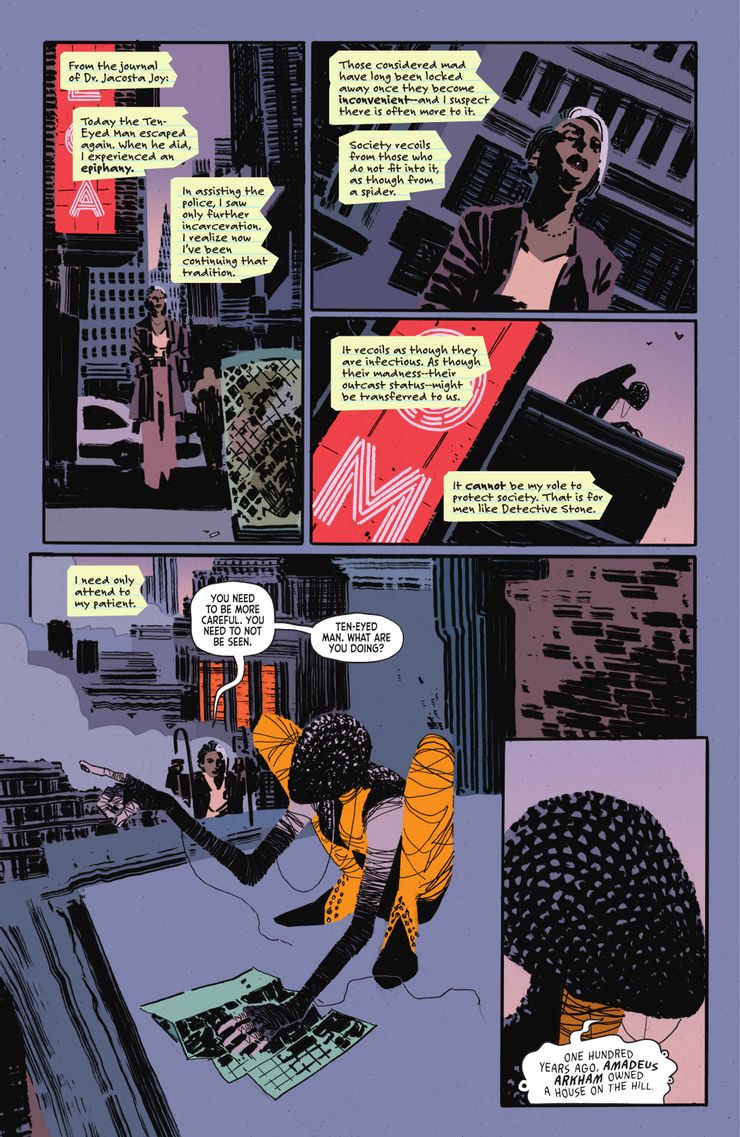 En el story, La Dra. Jacosta Joy intenta encontrar y asegurar a sus pacientes después de los eventos de A-Day. A medida que la ciudad se vuelve cada vez más hostil hacia los antiguos residentes del ahora desaparecido Arkham Asylum, Joy se involucra en una carrera contrarreloj para recuperar a sus pacientes antes de que sean perseguidos por los ciudadanos de Gotham y un ángel vengador en particular. La Dra. Joy necesita toda la ayuda que pueda obtener y, al asociarse con su paciente, The Ten-Eyed Man, puede coordinarse con la policía para salvar a un paciente justo a tiempo.