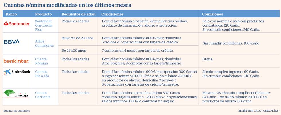 El paso dado por Santander es similar al movimiento realizado por CaixaBank en octubre. La entidad unificó toda su oferta en el programa Día a Día, que exige domiciliar una nómina de 600 euros (o pensión de 300) y domiciliar al menos tres recibos o realizar un mínimo de tres compras con la tarjeta de crédito al trimestre para tener una cuenta libre de comisiones. Estas condiciones ya estaban vigentes en su producto más comercializado, la Cuenta Family, aunque el banco ha elevado las comisiones de 60 a 240 euros anuales si no se cumplen. Durante este último año, la banca tradicional también ha ido fomentando la contratación de sus cuentas online, eliminando comisiones y requisitos de vinculación.