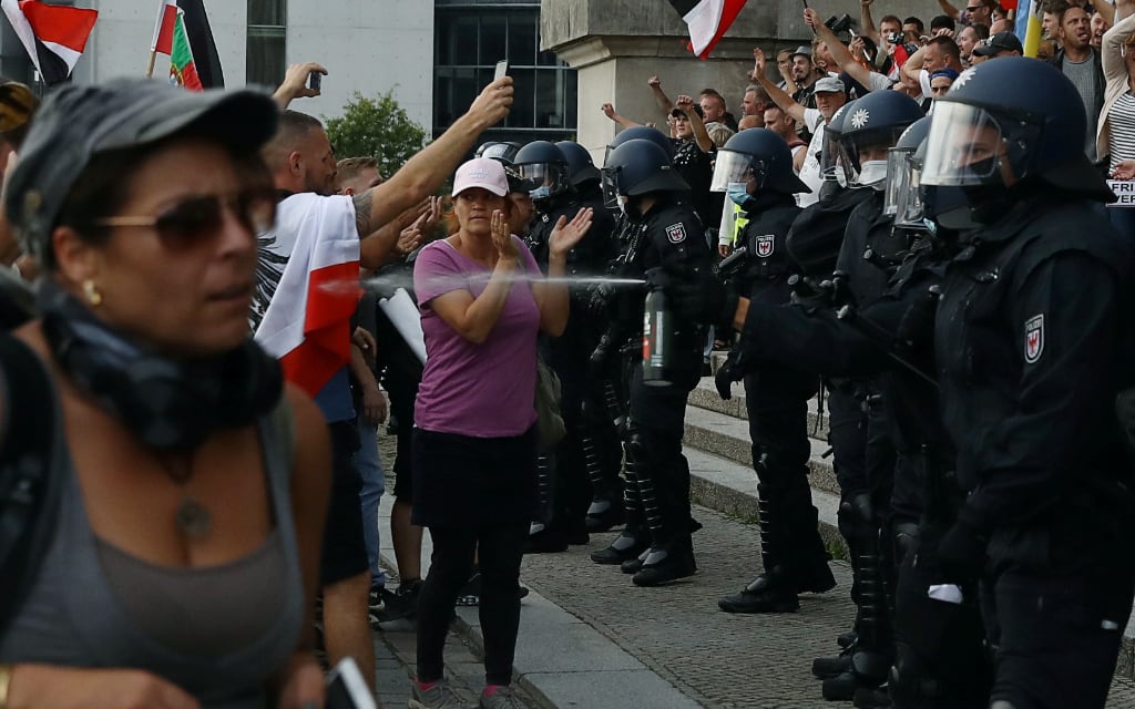 El sábado fueron detenidas unas 300 personas durante una manifestación contra las medidas por el nuevo coronavirus y de ultraderecha que reunió a unas 38 mil personas. Durante la protesta intentaron asaltar el Rechstag, sede del Parlamento alemán, entre banderas del Reich o Imperio Alemán, una enseña utilizada por grupos de ultraderecha. (Europa Press)