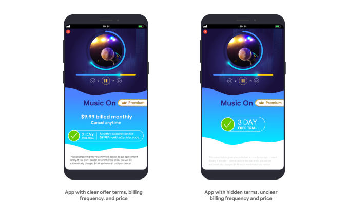 La nueva política de Google Play dice que los desarrolladores deberán ser explícitos sobre sus términos de suscripción, pruebas y ofertas, al decirles a los usuarios lo siguiente: