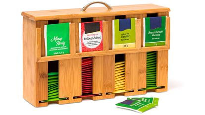 Similar a la caja superior, este modelo de forma cuadrada es perfecto para espacios reducidos. Ofrece igualmente cuatro compartimentos hasta para 40 sobres de té cada uno, a los que se puede acceder desde la abertura inferior de cada espacio. El marco de madera en cada lado permite identificar fácilmente los sabores y, lo que es mejor, el dispensador puede girar para que sea sencillo retirar las bolsitas. Está elaborada en madera de bambú, que es elegante y resistente.