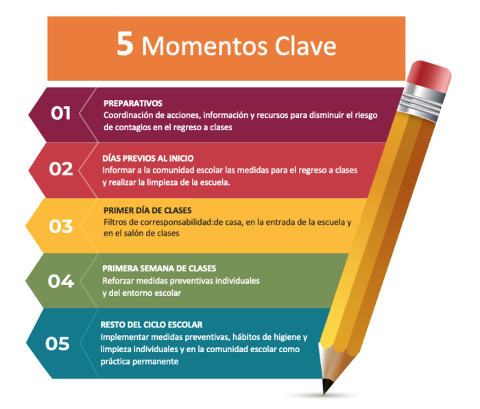 Los lineamientos establecen nueve acciones para hacer de las escuelas un espacio seguro y enlista los momentos clave en los que deben participar niños, padres, maestros y trabajadores asociados a la educación: