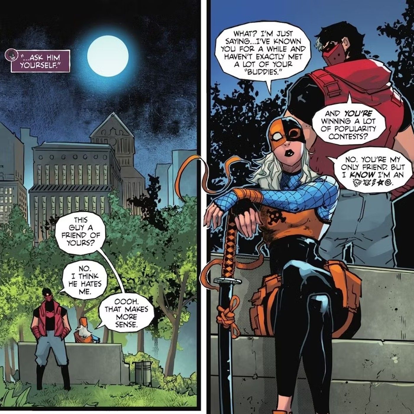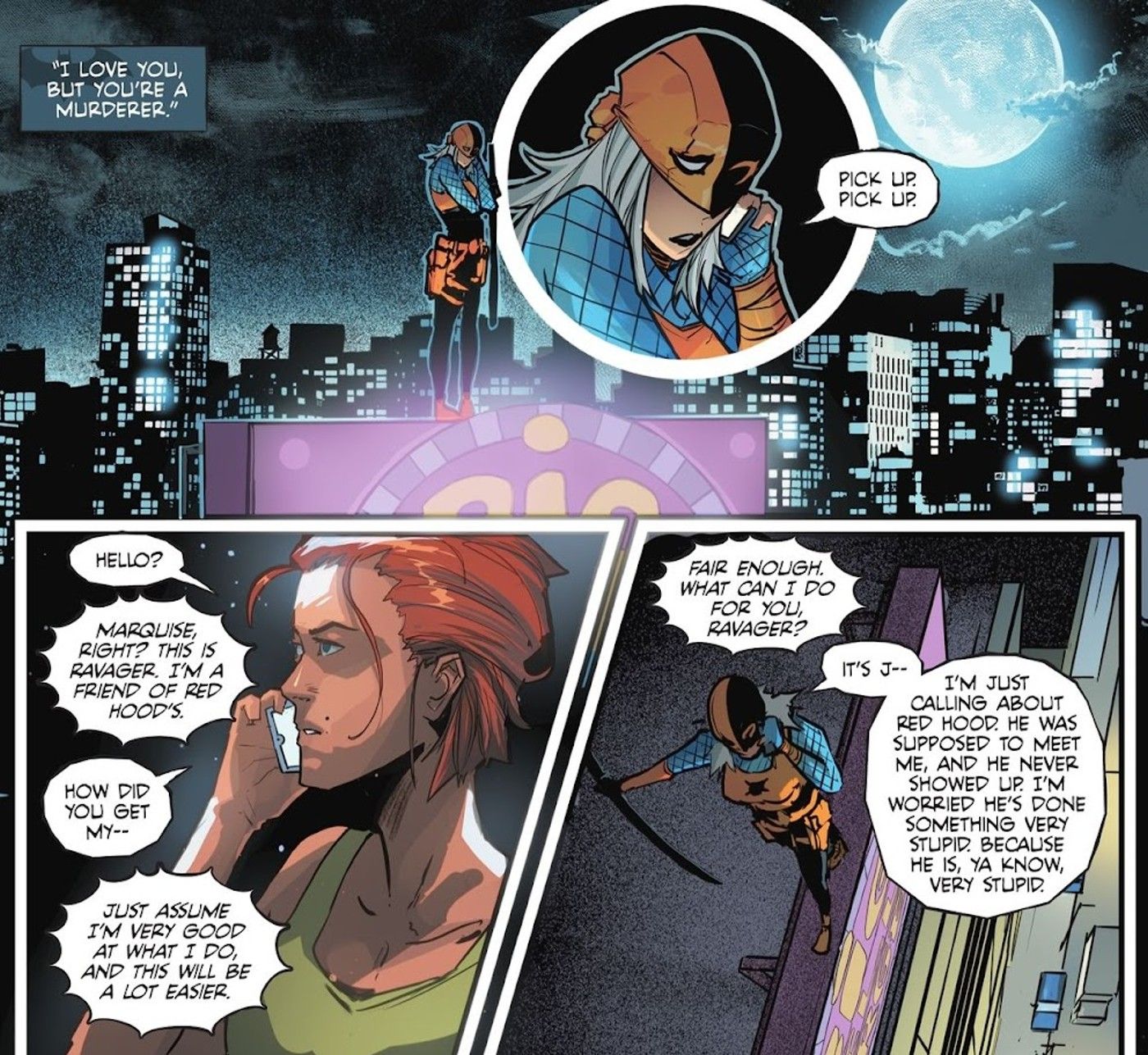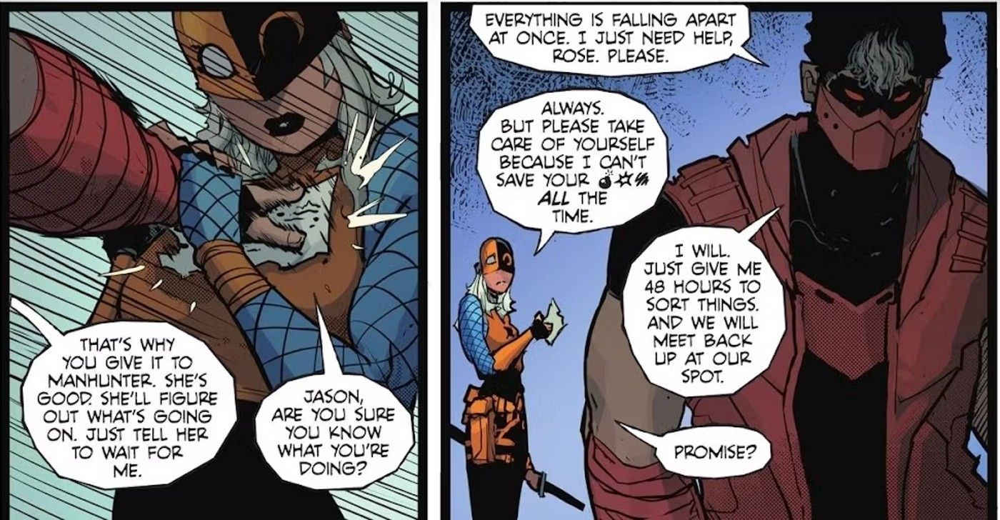 Jason Todd y Rose Wilson tienen mucho en común. Comparten personalidades igualmente abrasivas y han desempeñado el papel de héroe y villano, además de ser combatientes increíblemente hábiles (gracias en parte al intenso entrenamiento y las expectativas de sus respectivas figuras paternas). En resumen, han encontrado muchas cosas con las que unirse. Rose incluso dice en este número que Jason es ella “única amiga,” y no puede ignorar la idea de que Jason podría estar en problemas si no cumple su promesa. Rápidamente toma medidas para averiguar si está a salvo llamando a “Marquise”, pero sin darse cuenta establece Scandal y Vanda; Salvaje después de Jason.