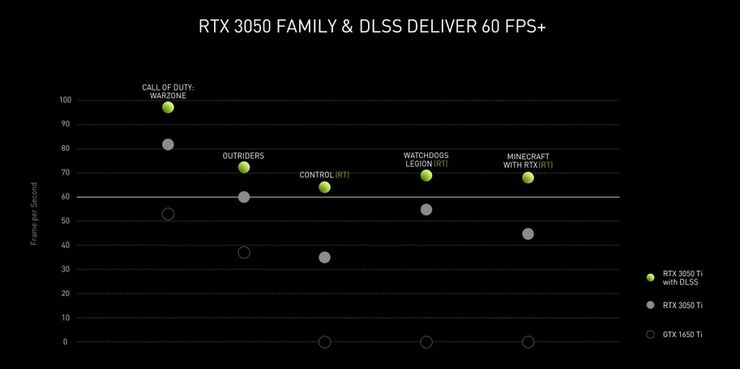 Como se señaló anteriormente, los nuevos modelos son RTX 3050 y 3050 Ti. Ambas son GPU móviles diseñadas específicamente para portátiles de juegos, que ofrecen funciones como trazado de rayos y DLSS basado en IA. Ejecutar juegos como Minecraft RTX y Call of Duty: Black Ops Cold War en configuraciones medias, los modelos 3050 y 3050 Ti ofrecen juegos a 60 fps con una resolución de 1080p. Nvidia dice que este nivel de rendimiento es “dos veces más rápido que los sistemas de generaciones anteriores”, lo que significa que cualquier persona con una computadora portátil para juegos económica de hace unos años puede esperar mejoras notables en el rendimiento. DLSS es una característica clave de las nuevas tarjetas. Permite a los jugadores ejecutar títulos a resoluciones más bajas, usa IA para mejorar todo y da como resultado una experiencia de juego de mayor nivel en el hardware menor. Por ejemplo, Call of Duty: zona de guerra puede alcanzar 80 fps sin DLSS habilitado en el RTX 3050 Ti, pero se arrastra hasta 95 fps cuando está encendido. DLSS que se ejecuta en el 3050 Ti también ve que la tarjeta alcanza más de 70 fps en Outriders, donde la GTX 1650 Ti que está reemplazando ni siquiera puede alcanzar los 40 fps.