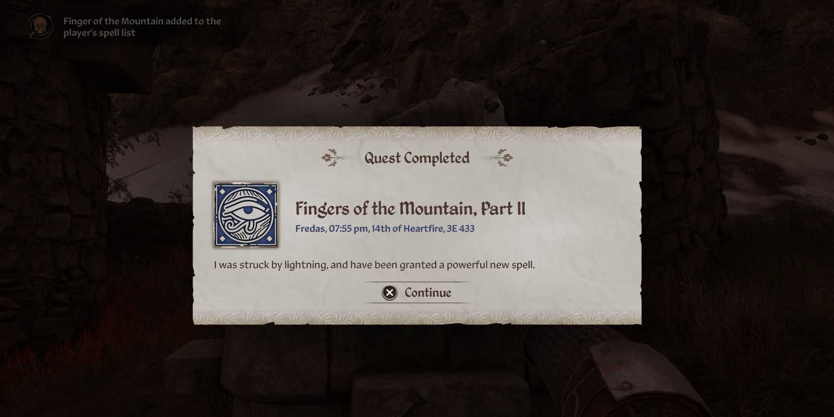 El pasaje establece que golpear el pilar en Cloud Top con un hechizo de choque hará que algo suceda, aunque no está claro qué. Si presta atención a su consejo, regrese a la cima de la nube y Usa un hechizo de choque en el pilarrecibirás un hechizo de choque nivelado llamado Finger of the Mountain, terminando la búsqueda. Si no tiene el hechizo de choque necesario y aún no limpió el cofre de Jauffre, puede pasar por Weynon Priory y tomar un desplazamiento de choque allí. No tuve suerte de encontrar uno en el gremio de magos o la tienda en la ciudad.