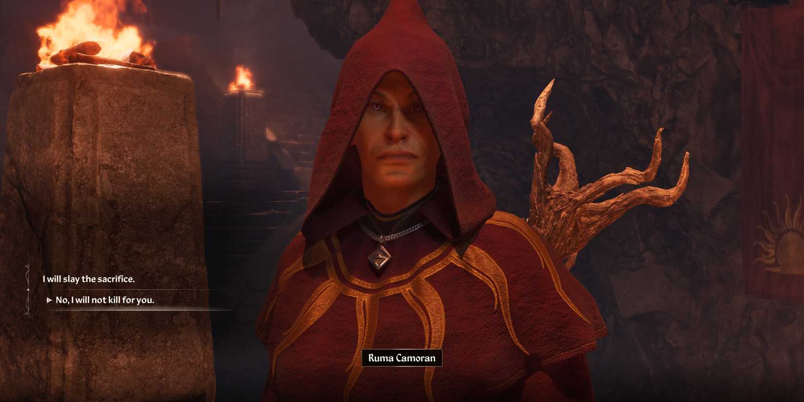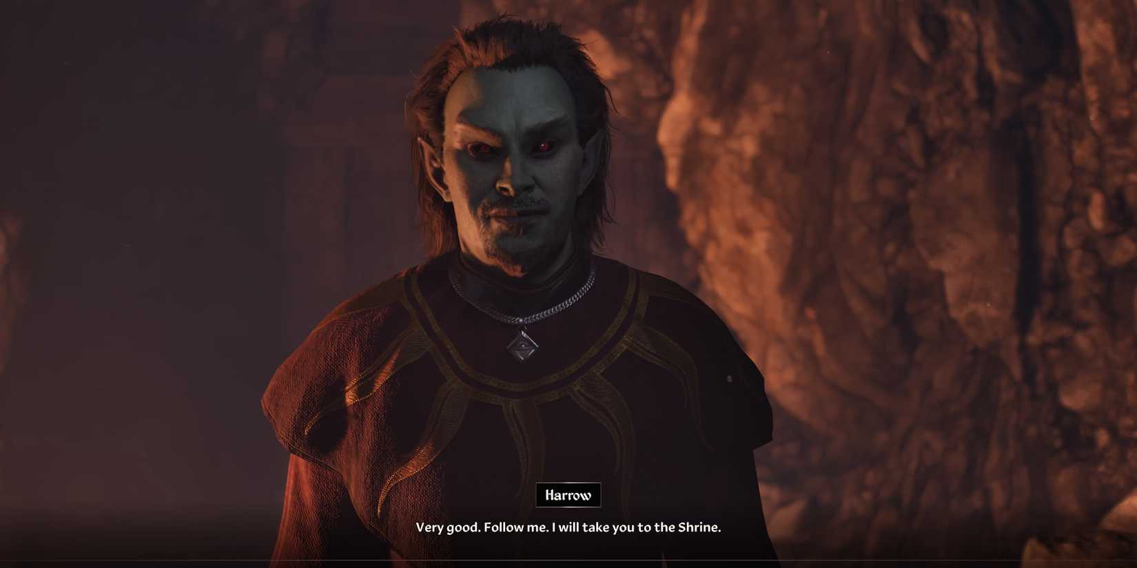 Suponiendo que entregue sus artículos a Harrow, puede seguirlo a las cuevas para alcanzar el santuario, donde está en progreso un ritual de cultista. Después de recitar del Misterio xarxesEl mítico líder del amanecer Mankar Comoran desaparece en un portal, llevando el amuleto de reyes con él. Los cultistas luego le darán atención a usted, Pidiendo al personaje del jugador que tome una daga y matara a Jeeliusun sacerdote argónico que ha sido atado y preparado como un sacrificio.