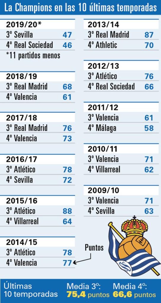 League. El tercer clasificado en la Liga ha firmado una media de 75,4 puntos en las últimas 10 campañas ligueras. Para llegar a ese guarismo, improbable este curso con una tercera posición más abierta, los txuri urdin deberían obtener la friolera de 29 puntos de 33. Vamos, prácticamente tendría que ganarlo todo. Nadie aspira a eso y más teniendo en cuenta que el actual ocupante de la plaza, el Sevilla, luce sólo un punto más, 47.