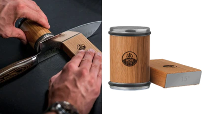 Fabricado en madera de roble y con certificado ecológico, consta de dos piedras de afilar situadas en ambos extremos: una de diamante con grano fino para el afilado (de 0,001 mm), capaz de trabajar con las hojas de acero más delicadas; y otra de acero inoxidable, para terminar de alisar la hoja y eliminar los restos de afilado.
