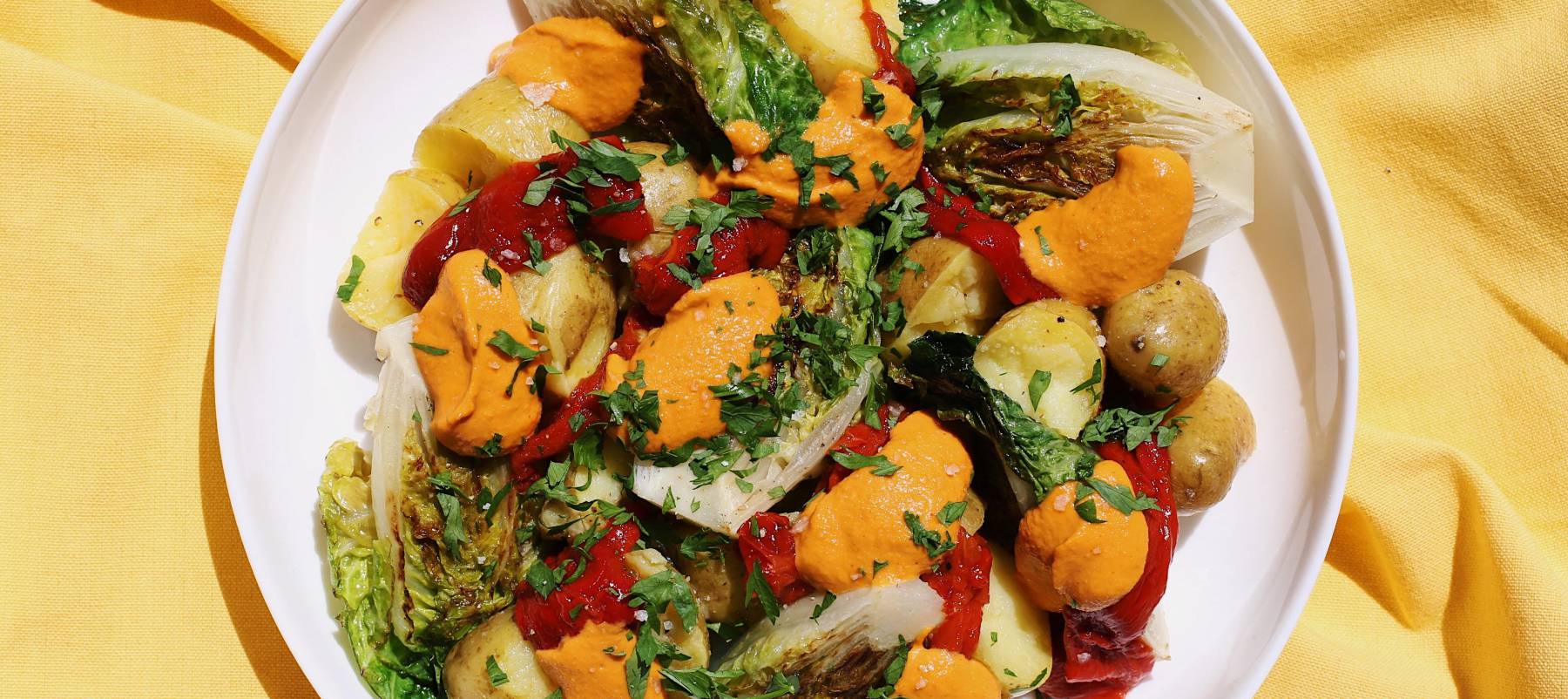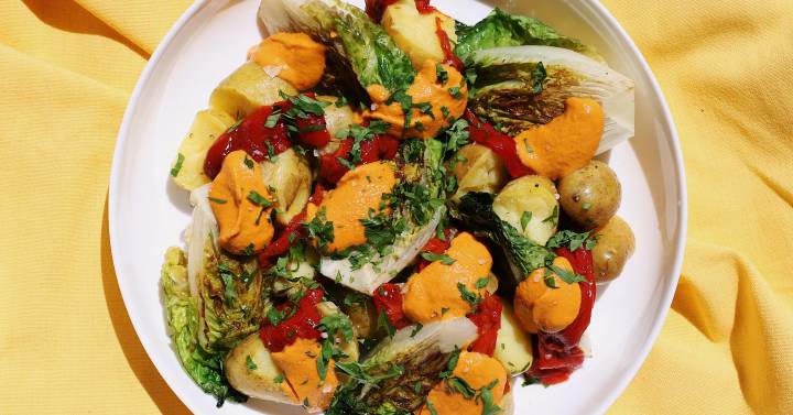 Unas verduras asadas que hayan sobrado de una barbacoa piden estar en una ensalada de papa. Podrían combinar perfectamente con romesco, al igual que la ensalada anterior, pero también van muy bien con un aliño clásico: seis cucharadas de aceite de oliva virgen extra, dos cucharadas de vinagre, una cucharadita de mostaza, una cucharadita de miel, sal y pimienta. Pica algunas hierbas frescas que tengas a mano -albahaca, perejil, eneldo, cebollino, etc.- y añade un poco de ralladura de limón. Si a esto le añades huevo cocido, pollo o alguna conserva de pescado, tienes un plato completo en un plis.