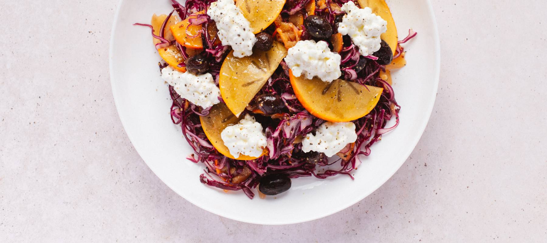 Col lombarda, caqui, queso cottage y aceitunas negras