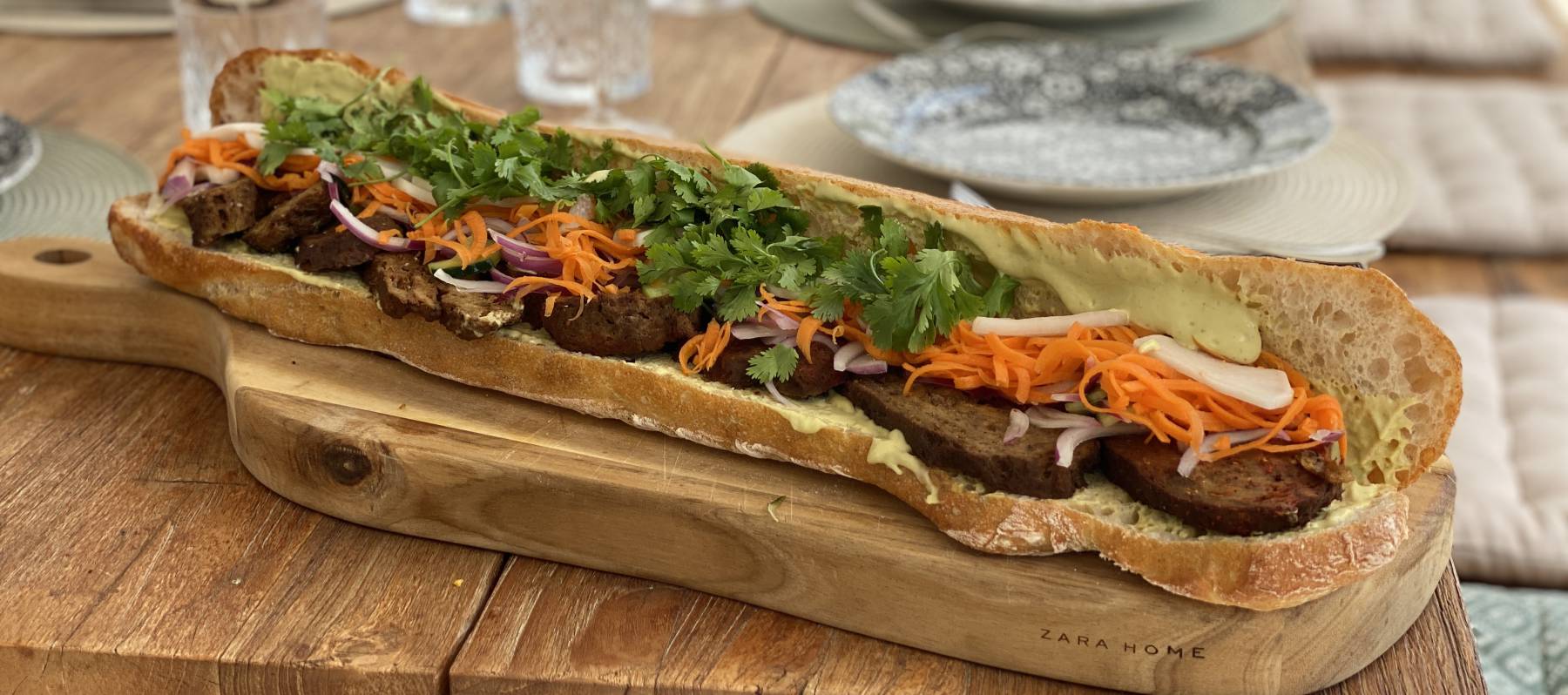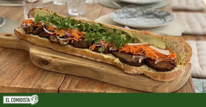 Un bocadillo completo de inspiración vietnamita, con un montón de verdura fresca y crujiente, el punto alegre del encurtido y una salsa untuosa y sabrosa que no tiene nada que envidiar a la mayonesa (y sin riesgo implícito de Salmonella). Empezaremos preparando las verduras encurtidas, con medio vaso de vinagre de manzana, medio de agua, una cucharada de azúcar y una cucharadita de sal (bien mezclado hasta que los sólidos se disuelvan). Lo ideal es rallarlas, espiralizarlas o hacer rodajas finas, para que la salmuera haga efecto rápidamente sin perder el crujiente.