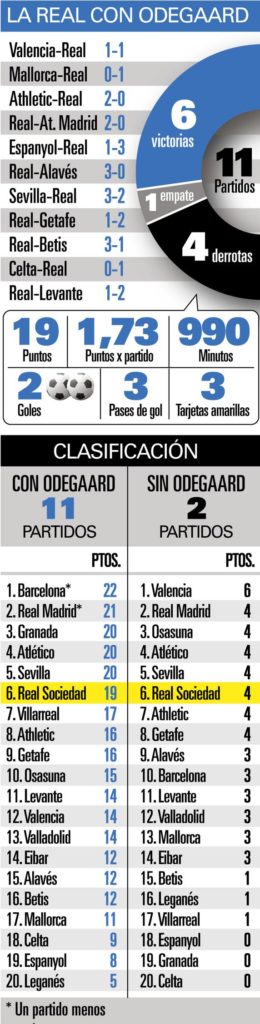 La Real ha funcionado con Odegaard al mando. Once partidos con el noruego se han saldado con seis victorias, un empate y cuatro derrotas, más de punto y medio por actuación. Siempre que ha podido, el nórdico ha jugado todos los minutos. 90 en cada encuentro, hasta caer lesionado y ausentarse contra Granada y Leganés. Es elemental en el esquema.
