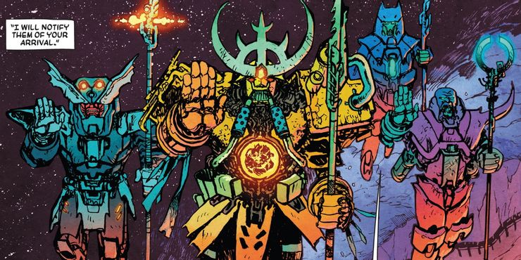 Cuando Beta Ray Bill llega a la puerta del portal en Beta Ray Bill # 2 – del escritor / artista Daniel Warren Johnson y el colorista Mike Spicer – es recibido por estos cuatro guerreros asgardianos de élite, cada uno con su propia armadura elaborada y empuñando un bastón resplandeciente de energía. Uno de ellos tiene un corazón ardiente visible a través de un ojo de buey con armadura, y los cuatro parecen inspirarse en el arte cósmico de Jack Kirby, creador de personajes como Galactus y New Gods de DC. Los guerreros le explican a Beta Ray Bill que si atraviesa el portal y regresa cambiado, con un vacío ennegrecido en los ojos, no dudarán en hacer lo que deben y sacarlo.
