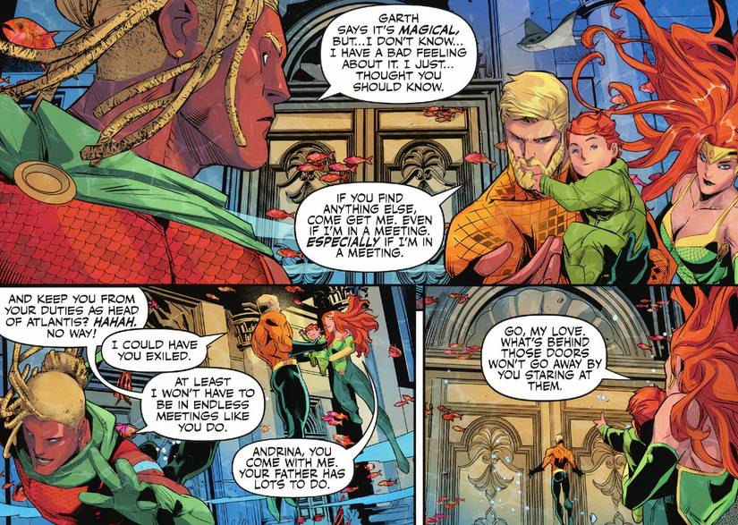 Mera es una de las mejores luchadoras de la Liga de la Justicia, por lo que es frustrante verla marginada hasta este punto, y su impotencia no es donde termina el maltrato. Como Reina de la Atlántida, debería participar estrechamente en las reuniones a las que asiste Aquaman a lo largo de este número. En cambio, lo despide mientras atiende a su hijo, a pesar de que los cuidadores han vigilado a Andrina en el pasado para que Mera pueda dedicar tiempo a gobernar junto a su marido. Mera ha servido como reina de la Atlántida con y sin Arturo a lo largo de los años, pero aquí se la representa solo como esposa y madre.
