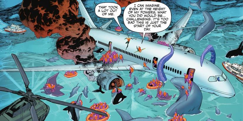 Aquaman no sólo posee los antiguos superpoderes de Mera, sino que también está cerca de superarla, y no puedo decir que sea un fanático de este desarrollo. Arthur lleva a cabo una misión de rescate con su hidrocinesis en la escena inicial de este número evitando que un avión se estrelle en el océano. Una vez que haya aterrizado de manera segura, dice Mera, “Incluso en la cima de mis poderes, lo que hiciste sería… desafiante”. Mera ha tenido décadas de práctica con estos poderes, incluso ganándose el respeto de Batman, pero Aquaman ya es igual de competente, si no más. Ahí radica mi principal queja: Mera ha sido degradada con el único propósito de mejorar Aquaman.