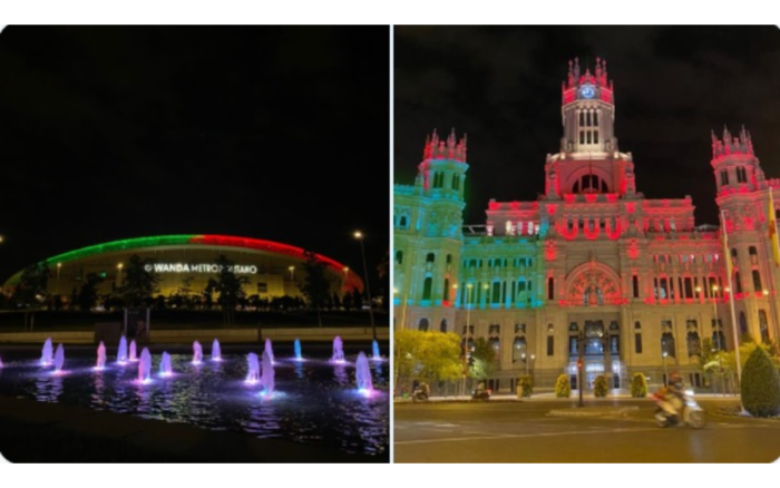 🇪🇸🇵🇹 El @Metropolitano y el Palacio de Telecomunicaciones se tiñen con los colores de las banderas de España y Portugal para apoyar su candidatura al Mundial de 2030.#SomosEspaña#SomosFederación pic.twitter.com/koij8sgw0g