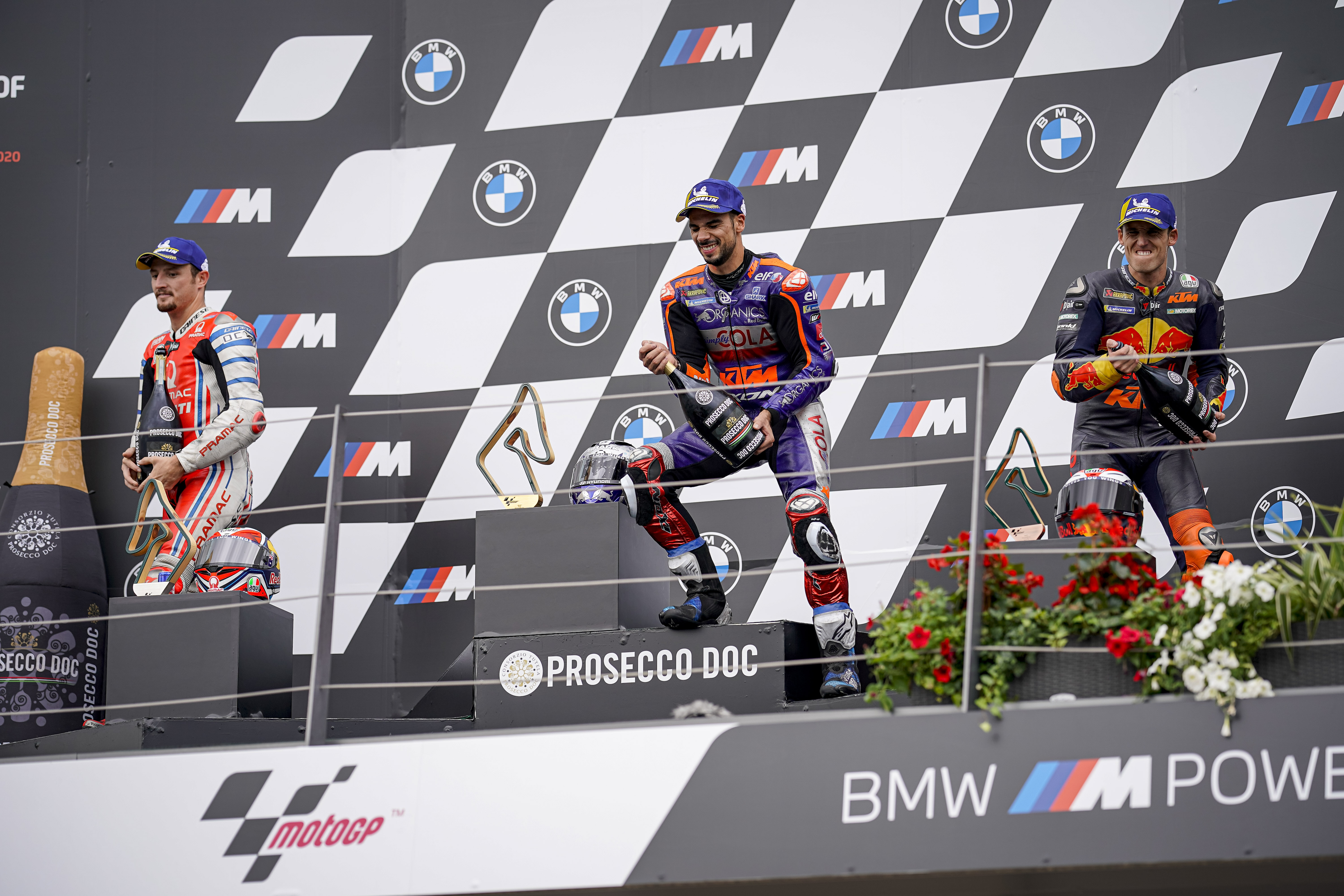 Miguel Oliveira celebra su primera victoria en MotoGP en el Red Bull Ring.CHRISTIAN BRUNA / EFELas carreras más dramáticas descubren a los héroes más inesperados. Ocurrió este domingo con Miguel Oliveira (Almada, Portugal; 25 años), ganador de su primera prueba en MotoGP. Ocurrió en Spielberg, escenario, de nuevo, de accidentes escalofriantes como el que protagonizó Maverick Viñales, que tuvo que tirarse de su Yamaha a casi 220 km/h porque le fallaron los frenos en plena recta. Escaparate conmovedor también el Red Bull Ring para un sinfín de luchas magníficas. Las más aplaudidas, las que se sucedieron en la última vuelta. Un último giro en el que Jack Miller quiso intentar arrebatarle la victoria a Pol Espargaró y en el que el de Granollers quiso defender a toda costa el primer puesto; una vuelta en la que Dovizioso y Binder apuraron sus opciones de acercarse a los tres primeros. Pero todos fracasaron en su intento. Todos, menos Oliveira. “He tenido mucha suerte”, concedería después.Se elevó el piloto satélite de KTM entre los grandes favoritos. Y logró el triunfo en la casa de la marca austriaca, cuyo patrocinador principal, Red Bull, es hoy el propietario de un circuito tan majestuoso como exigente para las MotoGP. En Spielberg los pilotos se sacan los codos a 200 km/h y el trazado lleva los frenos a situaciones tan extremas que anduvieron las Yamaha perdidas todo el fin de semana: acongojado Quartararo una y otra vez en la frenada de la curva cuatro, esa en la que se pasa de 300 km/h a 60; aliviado Viñales una semana más por salvarse en un accidente al que nadie quiere dar muchas más vueltas. Su M1 le dejó sin frenos al final de la recta de meta. Y el catalán no contempló más opción que deslizarse por el lateral de su moto y lanzarse al suelo para evitar colisionar, como hizo la máquina, contra las protecciones de aquella primera curva. El impacto fue tal que la moto estalló en llamas.Aquel incidente fue el que tiró a la basura todo el trabajo maravilloso hecho por Joan Mir hasta entonces. Imposible su ritmo para el resto de rivales, el de Suzuki llevaba dos segundos y medio de ventaja sobre Miller cuando empezó a ondear la temida bandera roja —obligada la suspensión de la prueba tras 16 vueltas por el accidente de Viñales—. Y al igual que le había pasado a Espargaró una semana atrás, el dominador de la carrera se quedó sin gomas nuevas para afrontar la segunda manga. Tuvo que salir a defenderse con la misma goma delantera que ya calzaba y una trasera nueva. No funcionó. Terminó cuarto. Y se volverá para casa sin ese ansiado primer triunfo, aunque con la admiración de sus contrincantes. “Era superior a todos. La victoria era suya”, le honraba Espargaró. “No podía seguirle”, reconoció Miller.Más informaciónRetomada la competición, Oliveira no solo puso gomas nuevas, sino que enmendó el error de la primera salida y cambió su opción de neumáticos: delante metió el más duro, como Espargaró. Además, el portugués rentabilizó como nadie la salida de esa segunda carrera a 12 vueltas: partía el séptimo y se colocó cuarto en apenas unas curvas. A seis vueltas para el final, percibió, lo mismo que Espargaró, que el hombre que lideraba la prueba, Joan Mir, tenía problemas para mantener el ritmo elevadísimo al que entre todos llevaron esa segunda y corta manga. Y las dos KTM adelantaron al mallorquín.Tras tomarle la posición a Mir, Espargaró logró también alcanzar a Miller, en cabeza. Y allí se situaron ambos, con Oliveira cuidándoles las espaldas. Su labor de escudero obtuvo la mejor de las recompensas cuando, al llegar a la última vuelta, ni el australiano ni el español quisieron conformarse con el segundo puesto. Aprovechó Miller la excepcional frenada de la curva cuatro para tomarle el interior al de KTM. Y quiso recuperar la posición Pol al llegar a las últimas dos curvas, la nueve y la diez. Lo intentó incluso por fuera. Y se abrieron tanto los dos que Oliveira, el único que dibujó la trazada perfecta en esos últimos metros, se las ingenió para cruzar la meta el primero.Tras el triunfo de Binder en Brno, este de Oliveira en Spielberg es la confirmación de KTM en un Mundial de MotoGP en el que reina la igualdad máxima en ausencia del rey destronado Márquez, lesionado de larga duración tras un accidente en la primera carrera del año en Jerez. La competencia es magnífica. Por el nivel de los pilotos que empiezan a tomar el relevo y por la mejora de marcas como KTM y Suzuki, tan fuertes como la Honda con la que últimamente solo brilla Nakagami (séptimo) o la Ducati que entiende como nadie Dovizioso; más fiables incluso que las Yamaha, con problemas de frenos en Spielberg justo cuando parecía que ya no tenían problemas con los motores.La frustración de ViñalesMaverick Viñales lo tuvo claro. Cuando tiró de la maneta y su Yamaha no reaccionó supo instantáneamente que se había quedado sin frenos. Se acercaba al final de la recta de meta. Su moto rodaba a más de 220 km/h. Así que optó por tirarse. “No me había pasado nunca. Me he pasado la carrera ajustando la leva del freno, me fallaba desde la cuarta vuelta. Estaba tomando precauciones para no llevarme a nadie por delante y, de repente, el freno explotó”, relata. Casi al mismo tiempo que su M1 se estampaba contra las protecciones, el piloto se levantaba del suelo de un brinco. Ni un rasguño. “No he pasado miedo, por suerte los circuitos son lo suficientemente seguros como para que si pasa esto tengas espacio para reaccionar, pero sí siento mucha frustración”, apuntó. Y añadió: “Creo que puedo estar mucho más delante”. Porque el problema con los frenos de este fin de semana —Quartararo, con una M1 igual que la suya los sufrió la semana anterior— se suma a las dificultades por la falta de agarre y a las dudas sobre la fiabilidad de los motores de la casa japonesa.Cuando vio su moto en llamas, una de las pri