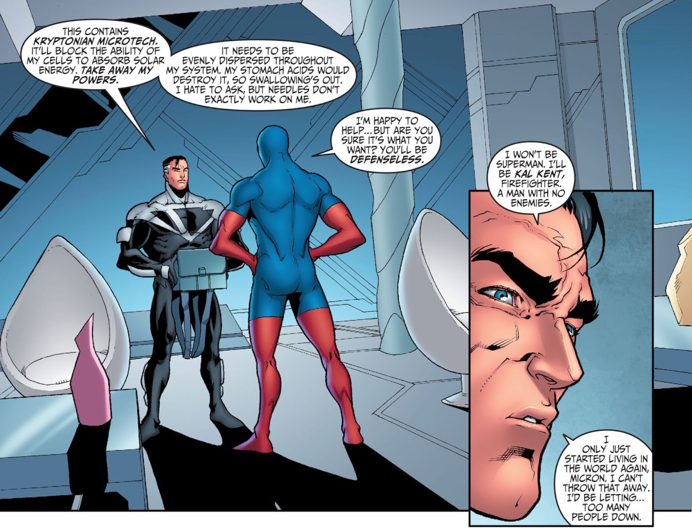 - El deseo de Superman de ser parte de la humanidad y su colección de tecnología kryptoniana en su Fortaleza de la Soledad lo llevaron a poseer la tecnología para desactivar sus propios poderes.