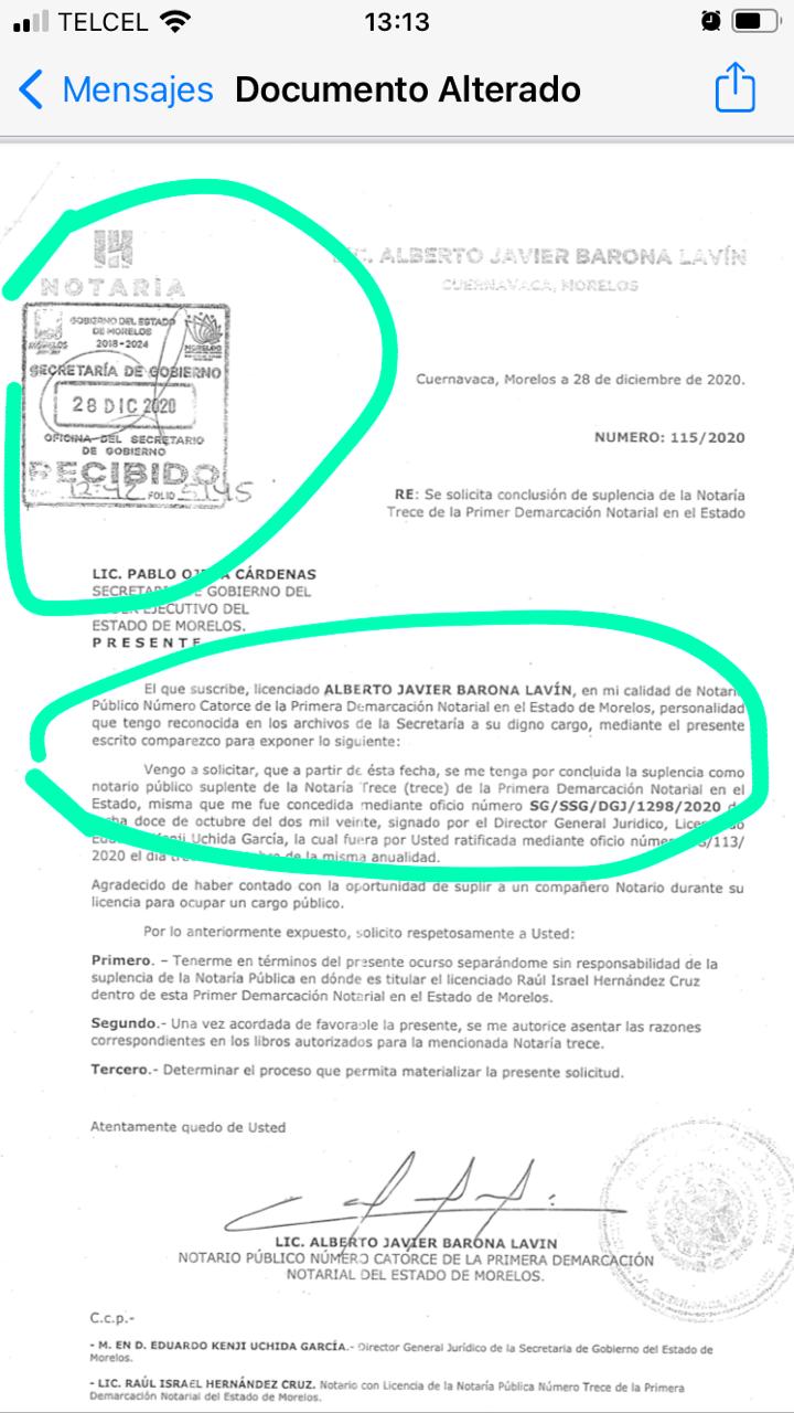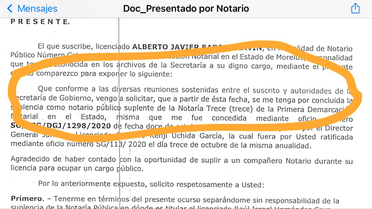 Ejemplifica que el 1 de Octubre un notario de Jojutla, que los estuvo supliendo, renunció porque no soportó las presiones del Gobierno de Morelos.