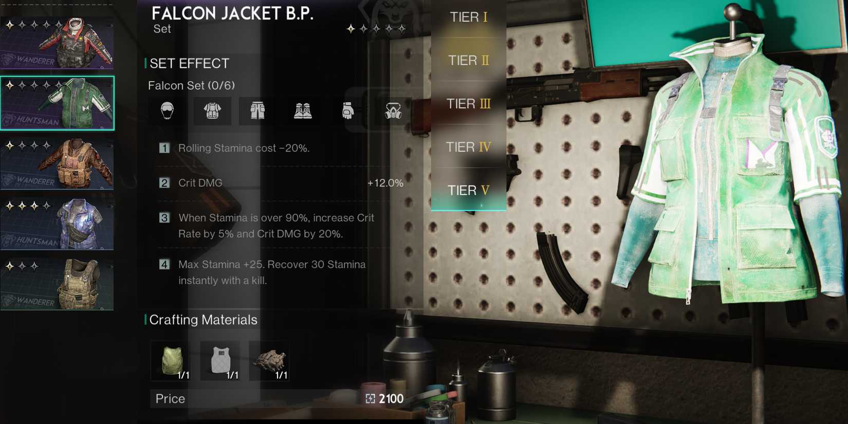 Como todo el equipo en Una vez humanopuedes crear el conjunto usando elementos de calidad de nivel I a nivel V. Cuanto más alto sea el nivel que fabriques, mejor será la calidad del equipo, como HP, puntuación de equipo y durabilidad total. También es importante tener en cuenta que este conjunto, como la mayoría de los conjuntos de equipo, tiene un beneficio máximo de cuatro piezas por conjunto. Si eliges usar más de cuatro piezas, no obtendrás ningún efecto pasivo adicional. Se recomienda que uses solo cuatro piezas del conjunto Falcon y luego uses otro conjunto que te beneficie para las otras dos ranuras de armadura.