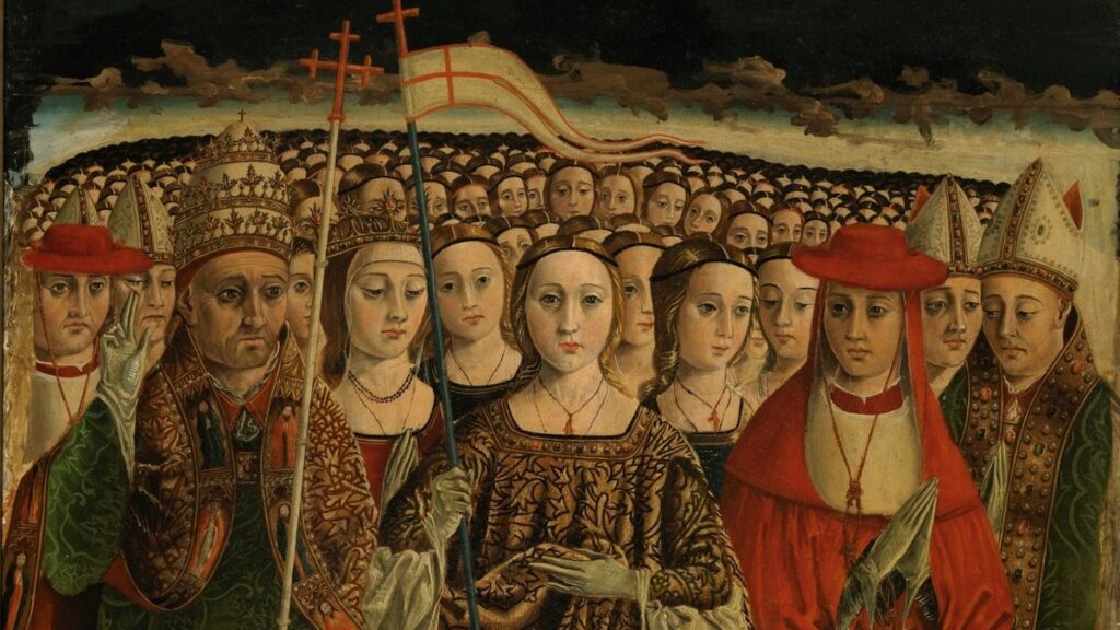 Entre esas historias, a mí me causa particular ternura la de Santa Úrsula de Colonia, la joven del siglo IV que, volviendo de Italia, fue martirizada en Alemania por las tropas de Atila. La narración de la leyenda aporta otros detalles: había ido a Roma para consagrar sus votos de virginidad y no peregrinaba sola sino con otras 11 doncellas. Pero alguien equivocó en algún momento la historia, y este error se explica a través de varias hipótesis: una de ellas es que cinco siglos después de Santa Úrsula, un copista escribió en latín el número XI para hablar de las 11 vírgenes en la frase “XI m virginum”, con una m que significa mártires (11 vírgenes mártires) pero que fue leída y copiada de nuevo como “once mil vírgenes”. La historia de las 11.000 vírgenes se extendió en las crónicas y la iconografía: cuadros y grabados europeos medievales representaron desde entonces a Úrsula rodeada de cientos de figuras, asentando la idea de que la masacre de los hunos aniquiló a 11.000 y no a 11 acompañantes.
