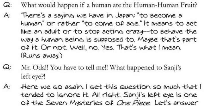 En la SBS por el volumen 20 de Una pieza, publicado en Japón en 2001, se le pregunta a Oda qué pasaría si un humano comiera la Fruta Humano-Humano. En este punto de la historia, la única instancia de este tipo de fruta que había aparecido era la versión estándar de la Fruta de Chopper. Por lo tanto, nadie se habría sorprendido si Oda hubiera dado una respuesta directa al respecto y no hubiera dado más detalles. Sin embargo, en lugar de hacer eso, dio un non sequitur muy peculiar sobre el idioma. “convertirse en un ser humano”, iba y venía sobre si eso explicaría o no lo que le sucedería a un humano que comiera la fruta, y luego escribió que se estaba escapando (por implicación, para evitar responder más a la pregunta). En ese momento, esto parecía como otra de las respuestas SBS más surrealistas de Oda, pero a la luz del último capítulo de Una pieza adquiere una dimensión completamente nueva.