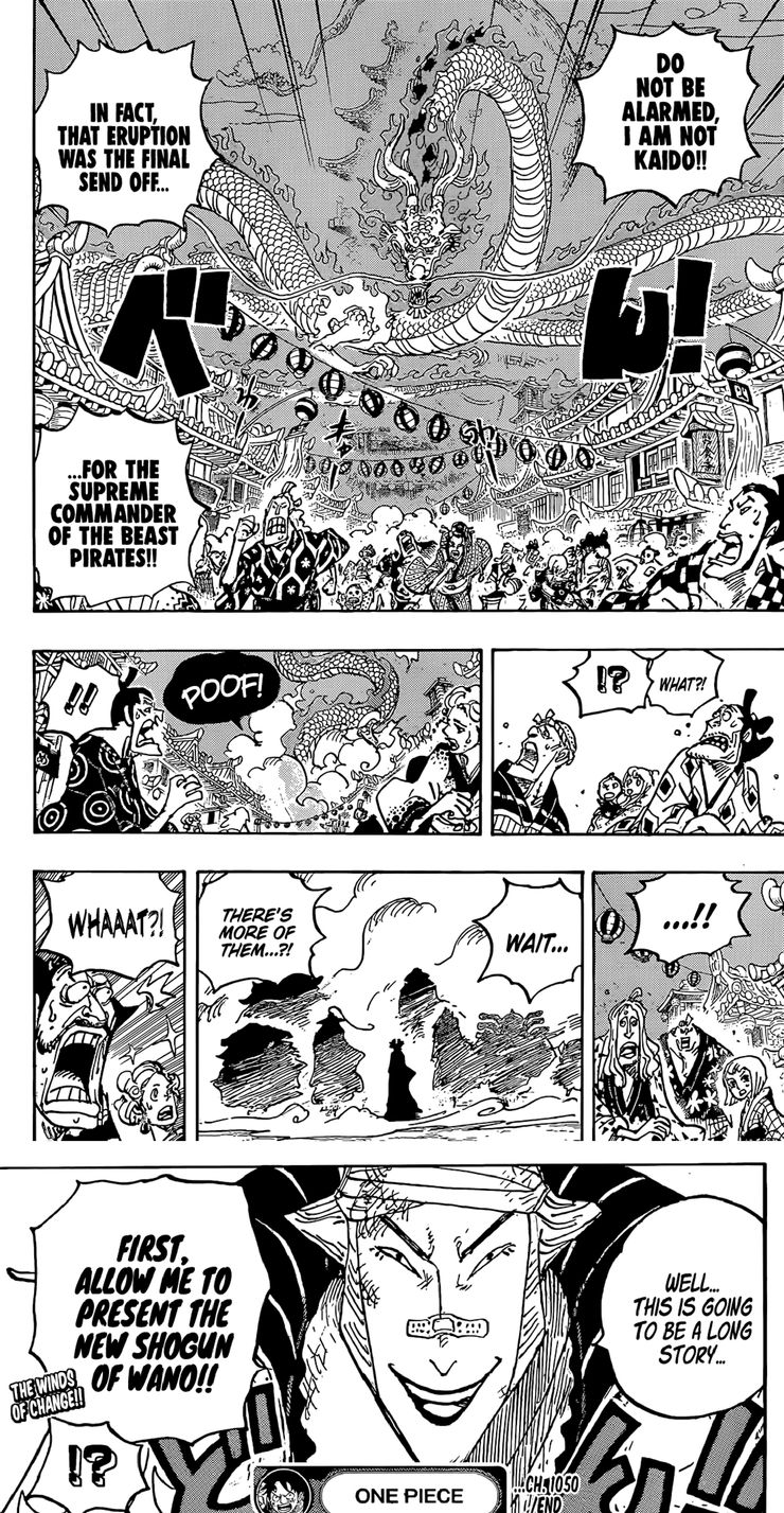 Todo lo que sucedió en Wano, de hecho, es consecuencia de la muerte de su último shogun legítimo, Kozuki Oden, a manos de Kaido, debido a la traición y las tácticas encubiertas del Yonko y su aliado, el usurpador Orochi. Desde entonces, Wano ha sufrido terriblemente bajo el yugo de sus nuevos gobernantes, con los habitantes reducidos a esclavos hambrientos. En el capítulo 1050, se anuncia oficialmente la derrota de Kaido, y la gran explosión subterránea no deja dudas de que los Yonko no regresarán. Los ciudadanos de Flower Capital reciben las buenas noticias de los fieles servidores de Oden, que esperaron y lucharon durante veinte años para vengar a su amo. El hijo de Oden, Momonosuke, comienza a transformarse de su forma de dragón. Cuando salga del humo en el próximo capítulo, habiendo envejecido veinte años instantáneamente gracias a la habilidad de Shinobu, probablemente se parecerá mucho a Oden. Denjuro anuncia “El nuevo Shogun de Wano,” lo que significa la restauración de la línea Kozuki y un nuevo amanecer para el país.