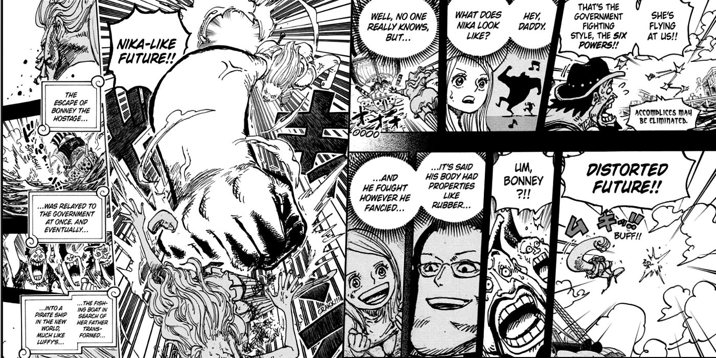 Capítulo #1101 de Una pieza El flashback de Bonney y Kuma cuando Bonney intenta huir del Reino Sorbet y los agentes del gobierno que la mantienen como rehén después de su recuperación para encontrar a Kuma. El capítulo revela Bonney puede usar su técnica Futuro Distorsionado para emular los poderes de la fruta del diablo de Luffy. mientras convierte su cuerpo en goma y golpea a Alpha, uno de los agentes de Cipher Pol, con un puño gigante muy parecido a la pistola gigante Gear Third de Luffy.
