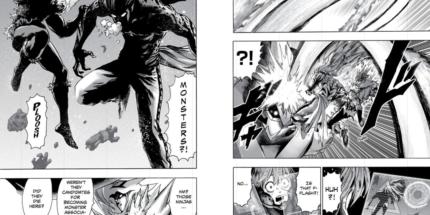 La Asociación de Héroes ha estado muy preocupada por revertir el proceso de monsterización desde el final del arco de la Asociación de Monstruos, y Flashy Flash acababa de presenciar experimentos con ese fin antes de salir a luchar contra los otros ninjas, por lo que la idea estaba fresca en su mente. Flashy Flash sabía que estos dos ninjas alguna vez fueron monstruos que él había matado, por lo que definitivamente fue una sorpresa verlos no solo vivos, sino humanos nuevamente.
