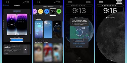 Los usuarios de iPhone también pueden modificar su fondo de pantalla desde la pantalla de bloqueo de su dispositivo. Simplemente mantenga presionada la pantalla hasta que aparezca el carrusel de selección de fondos de pantalla. Presiona el ‘+‘ para agregar un nuevo fondo de pantalla, o deslízate por las páginas y elige la que dice ‘Agregar nuevo.’ Una vez en el ‘Agregar nuevo fondo de pantalla‘, siga los pasos descritos anteriormente para elegir uno con temática de astrología. Además de los fondos de pantalla de la Tierra y la Luna, también hay una opción meteorológica dinámica que se actualiza en tiempo real según las condiciones climáticas en la ubicación del usuario.
