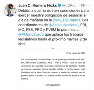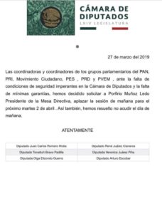 “Las coordinadoras y coordinadores de los grupos parlamentarios de PAN, PRI, Movimiento Ciudadano, PES, PRD y PVEM ante la falta de condiciones de seguridad imperantes en la Cámara de Diputados y la falta de mínimas garantías, hemos decidido solicitar a Porfirio Muñoz Ledo, presidente de la Mesa Directiva, aplazar la sesión de mañana para el próximo martes 2 de abril. Así también hemos resuelto no acudir el día de mañana”, se lee en el documento enviado por la oposición.