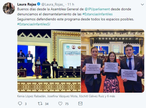 Afirmó que desde esa tribuna internacional, “los legisladores de nuestro país hicieron un enérgico llamado al Poder Ejecutivo Federal a restablecer el programa de estancias infantiles”.