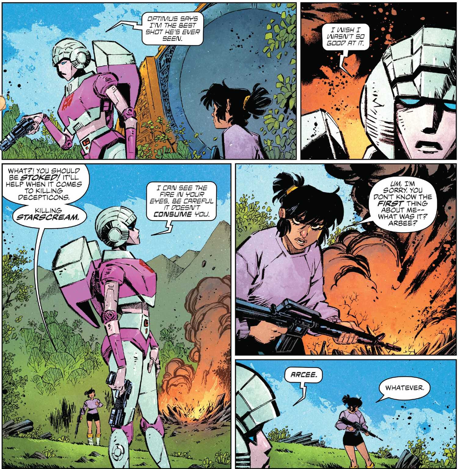 Transformadores #7 muestra su valor fuera del campo de batalla, ya que Arcee se apresura a advertir a la joven Carly sobre los peligros de quedar atrapada en el fragor de la batalla.. “Quería justicia para mi pueblo,“ Arcee explica, antes de confesar, “Ultra Magnus murió por mi culpa. Por mi camino de odio”. Aunque vienen de mundos diferentes, Arcee reconoce el dolor que está pasando Carly tras la muerte de su padre y le advierte que no caiga bajo el hechizo de la venganza, diciendo que ese camino “Se necesita más de lo que cura… si es que cura”.