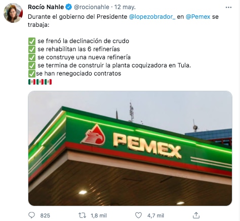 El tuit publicado el 12 de mayo dice: “Durante el gobierno del Presidente @lopezobrador_ en @Pemex se trabaja: se frenó la declinación de crudo, se rehabilitan las 6 refinerías, se construye una nueva refinería, termina de construir la planta coquizadora en Tula, se han renegociado contratos”. Esta publicación fue eliminada de Twitter y tampoco es visible en Facebook.