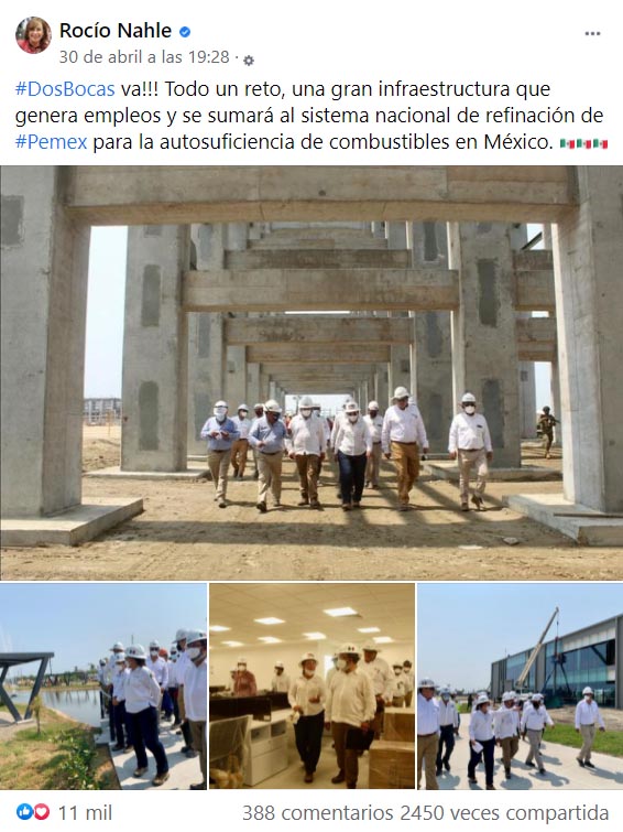 El tuit de 30 de abril, señala: “#DosBocas va!!! Todo un reto, una gran infraestructura que genera empleos y se sumará al sistema nacional de refinación de @Pemex para la autosuficiencia de combustibles en México”.