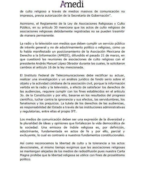“El Ifetel no ha otorgado concesión alguna a asociaciones religiosas. En todo momento, el Ifetel ha dado estricto cumplimiento a lo previsto en el marco legal para el otorgamiento de concesiones de radiodifusión y telecomunicaciones”, afirmó.