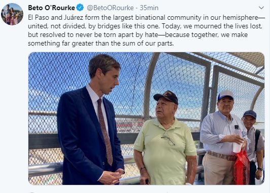 “Es un honor estar en Ciudad Juárez para darle mis condolencias al Gobernador Corral, al Alcalde Cabada, y a todos los que viven en la mitad mexicana de nuestra comunidad binacional. Hemos respondido al odio con amor, y nuestras comunidades están más fuertes y unidas que antes”, expresó en español O´Rourke a través de su cuenta en Twitter.