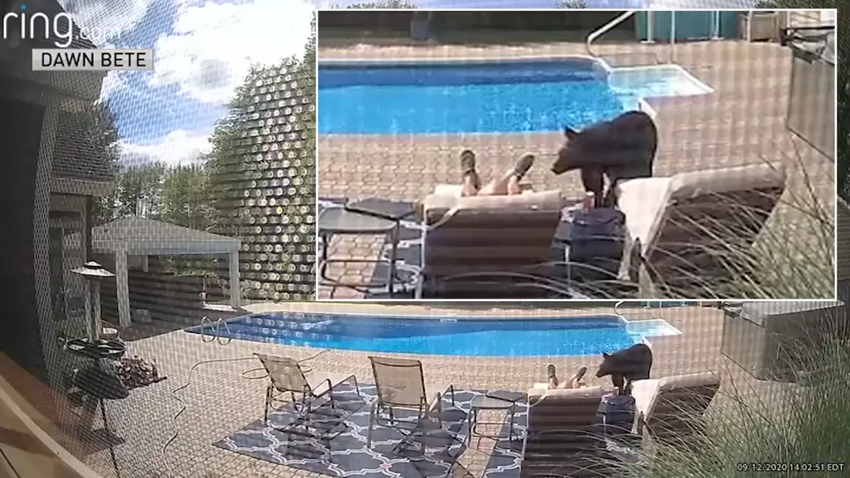 Oso curioso sorprende a hombre mientras descansa en su piscina